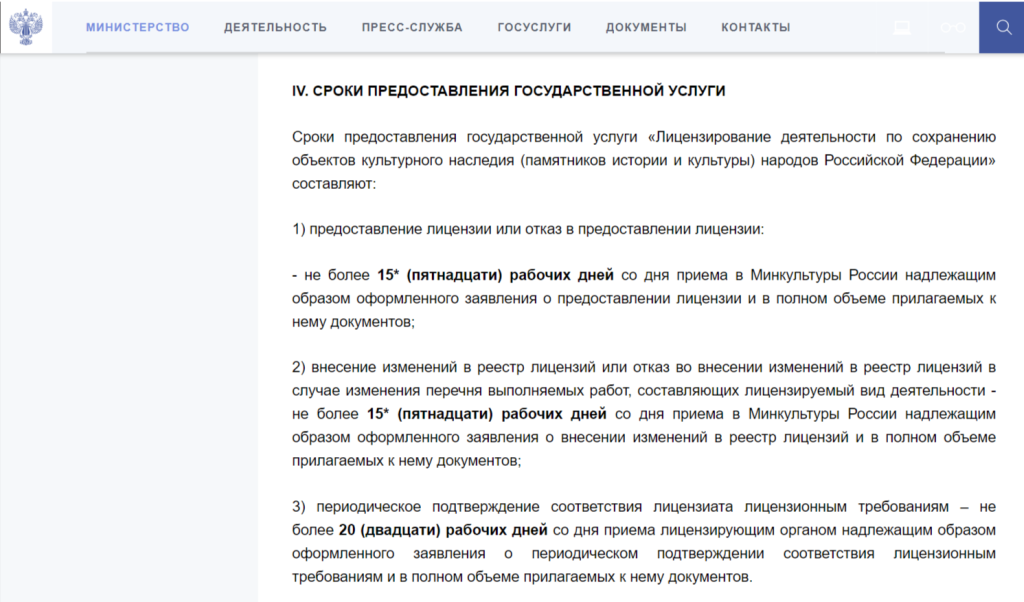 Сроки рассмотрения заявлений для получения лицензии Министерства Культуры должны были сократиться до 5 рабочих дней, с возможностью продления на один день для заявителей, планирующих выполнять более двух видов работ.