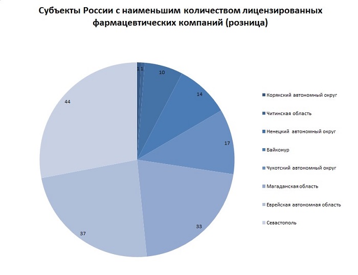 В остальных субъектах России зарегистрировано менее 500 розничных лицензиатов (в каждом субъекте). Наименьшее количество фармацевтических организаций, занимающихся розничной торговлей, приходится на: Читинскую область (1 лицензиат), Корякский автономный округ (1 лицензиат), Ненецкий автономный округ (10 лицензиатов), Байконур (14 лицензиатов), Чукотский автономный округ (17 лицензиатов), Магаданская область (33 лицензиата), Еврейская автономная область (37 лицензиатов), Севастополь (44 лицензиата).