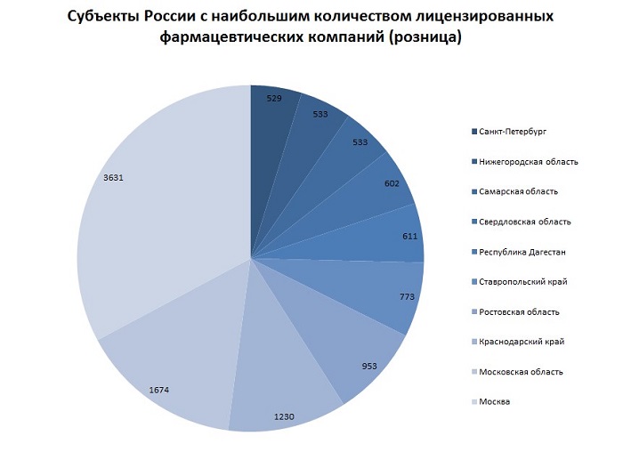 Больше всего розничной торговлей лекарственными средствами занимаются в Москве (3 631 лицензиат), Московской области (1 674 лицензиата), Краснодарском крае (1 230 лицензиатов), Ростовской области (953 лицензиата), Ставропольском крае (773 лицензиата), Дагестане (611 лицензиатов), Свердловской области (602 лицензиата), Самарской области (533 лицензиата), Нижегородской области (533 лицензиата), Санкт-Петербурге (529 лицензиатов).
